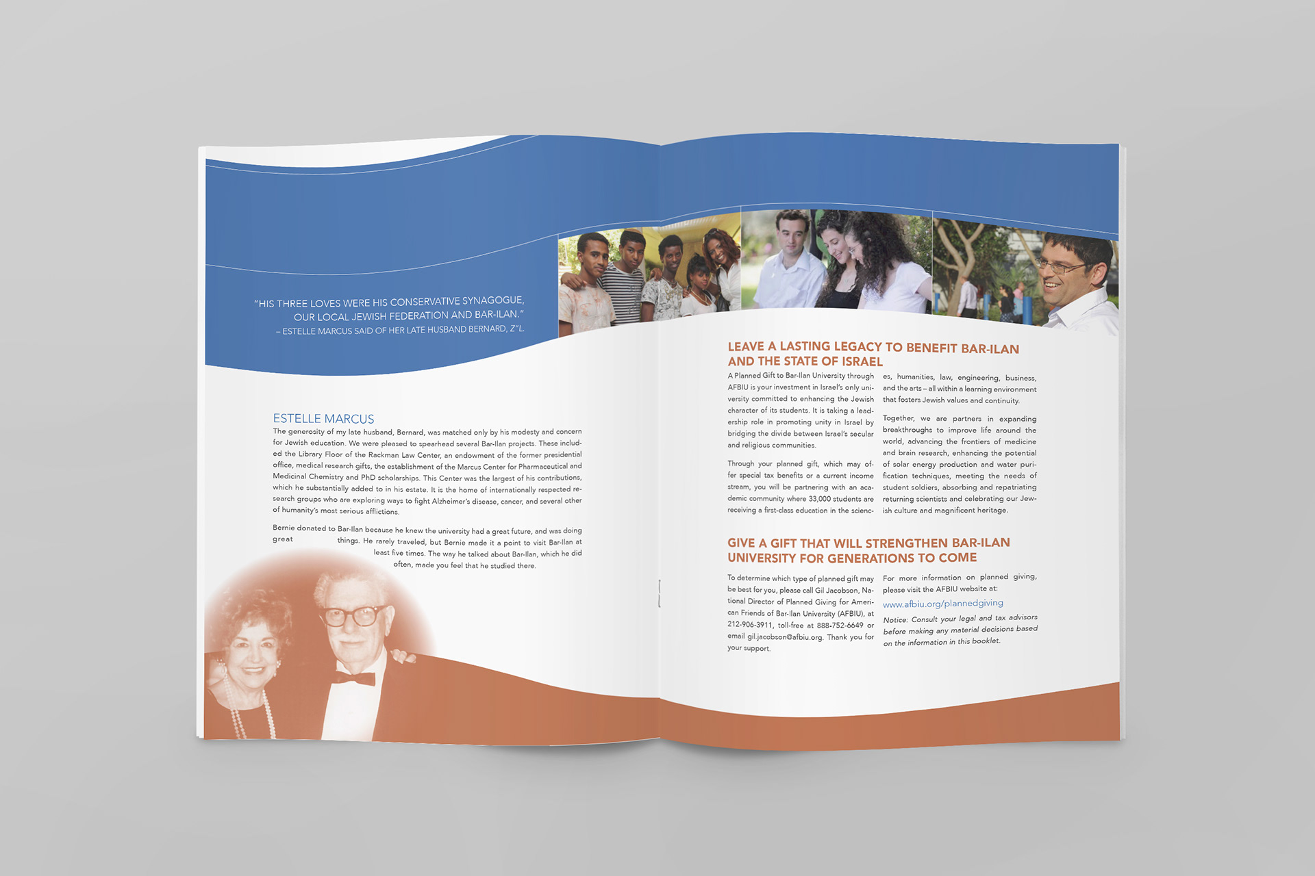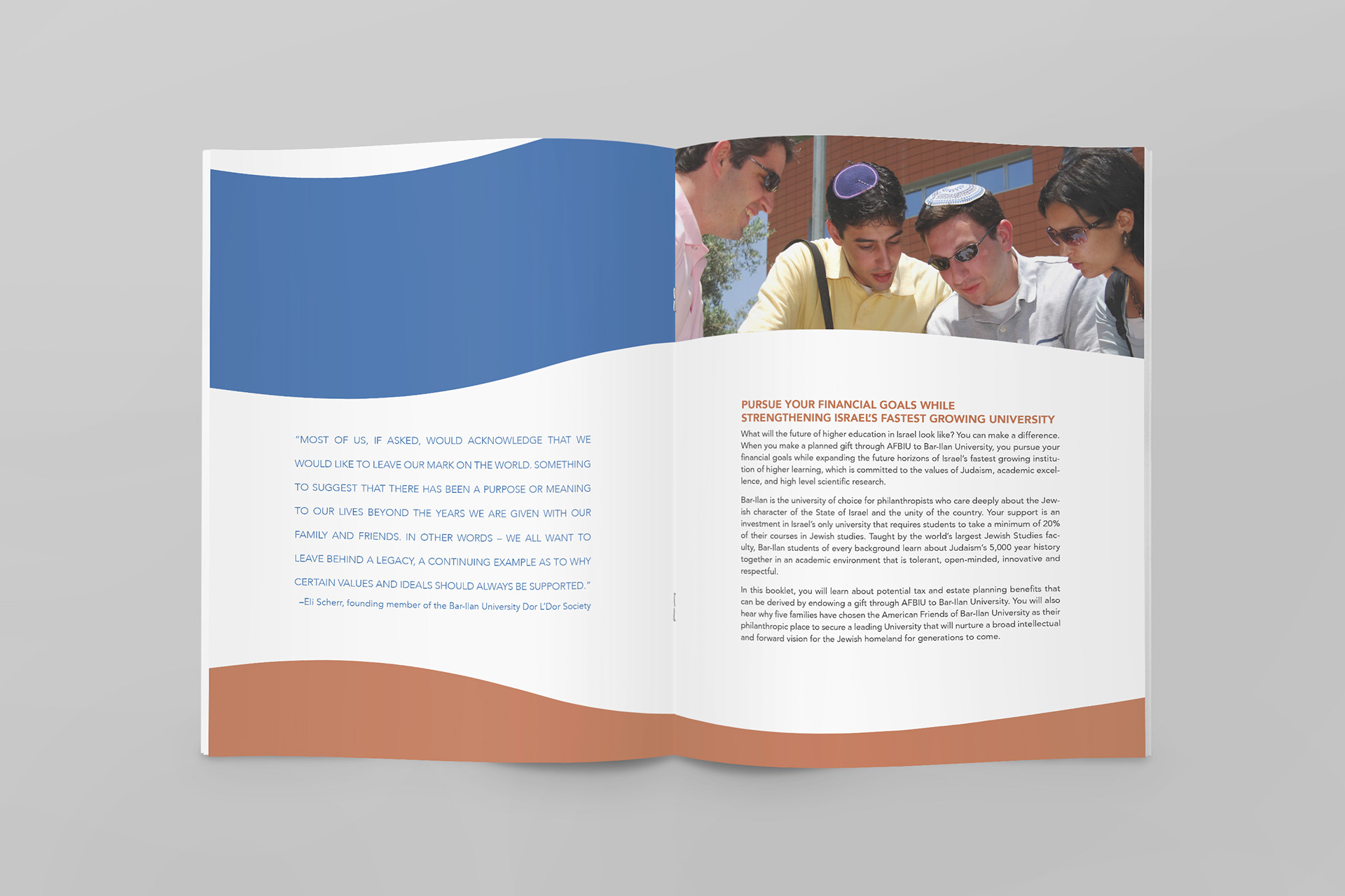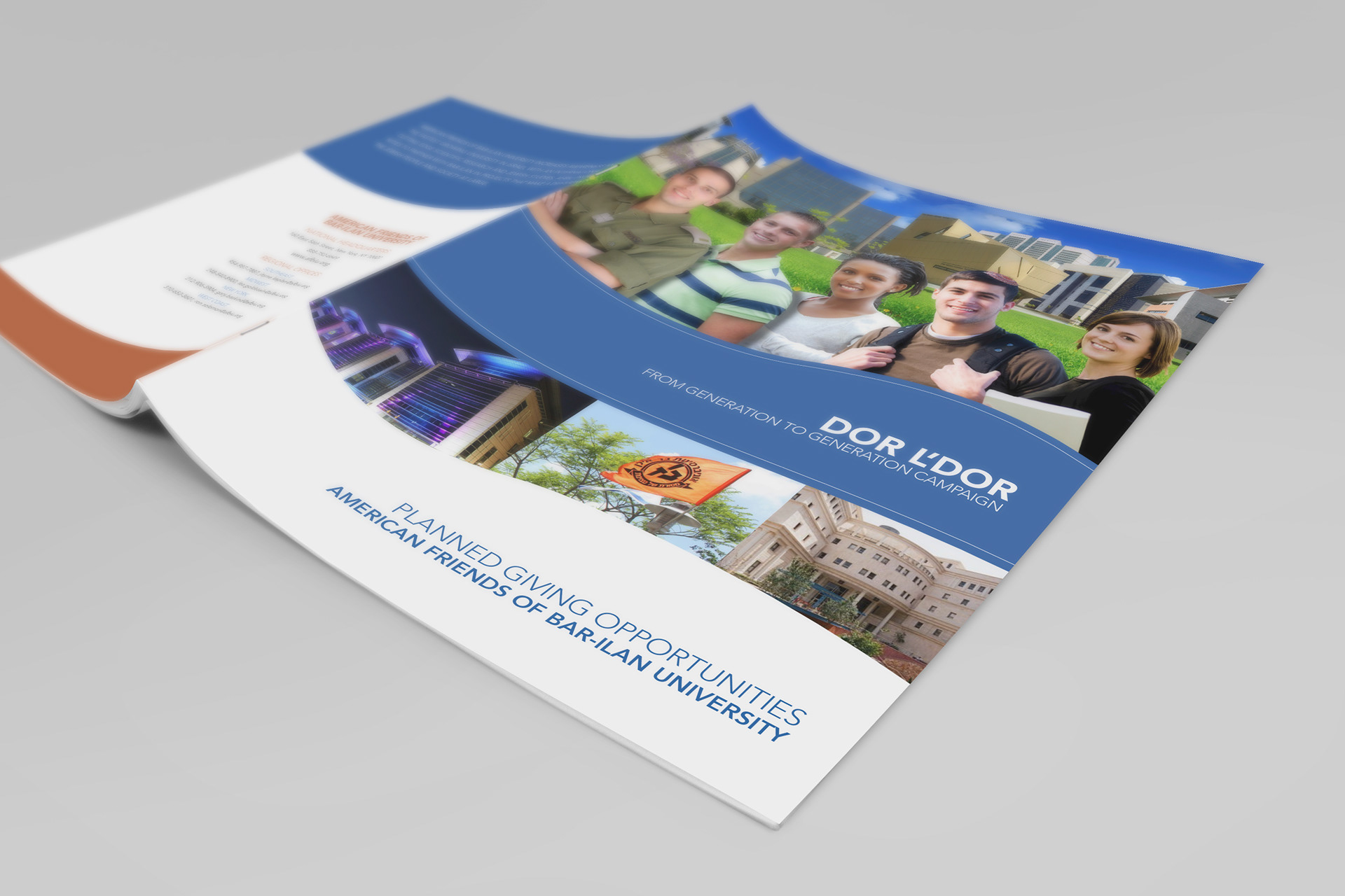 American Friends of Bar Ilan University initiated a "From Generation to Generation" planned giving campaign to support the endowment fund for the largest growing university in Israel. I created the publicity brochure for this campaign.
