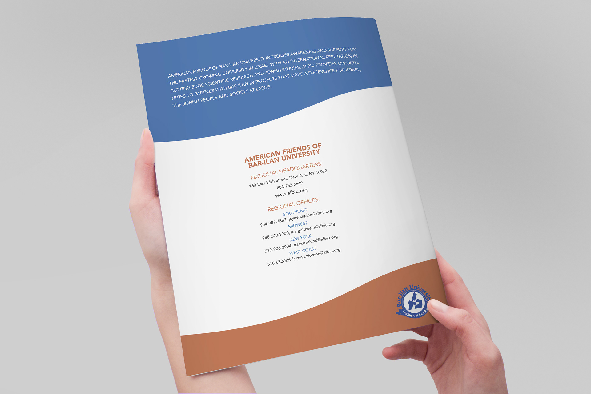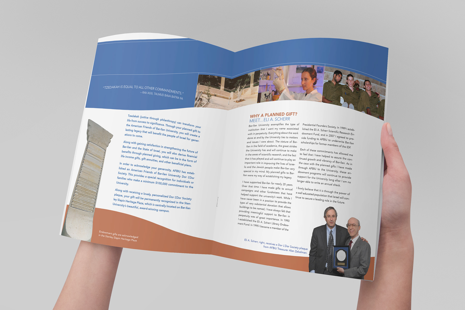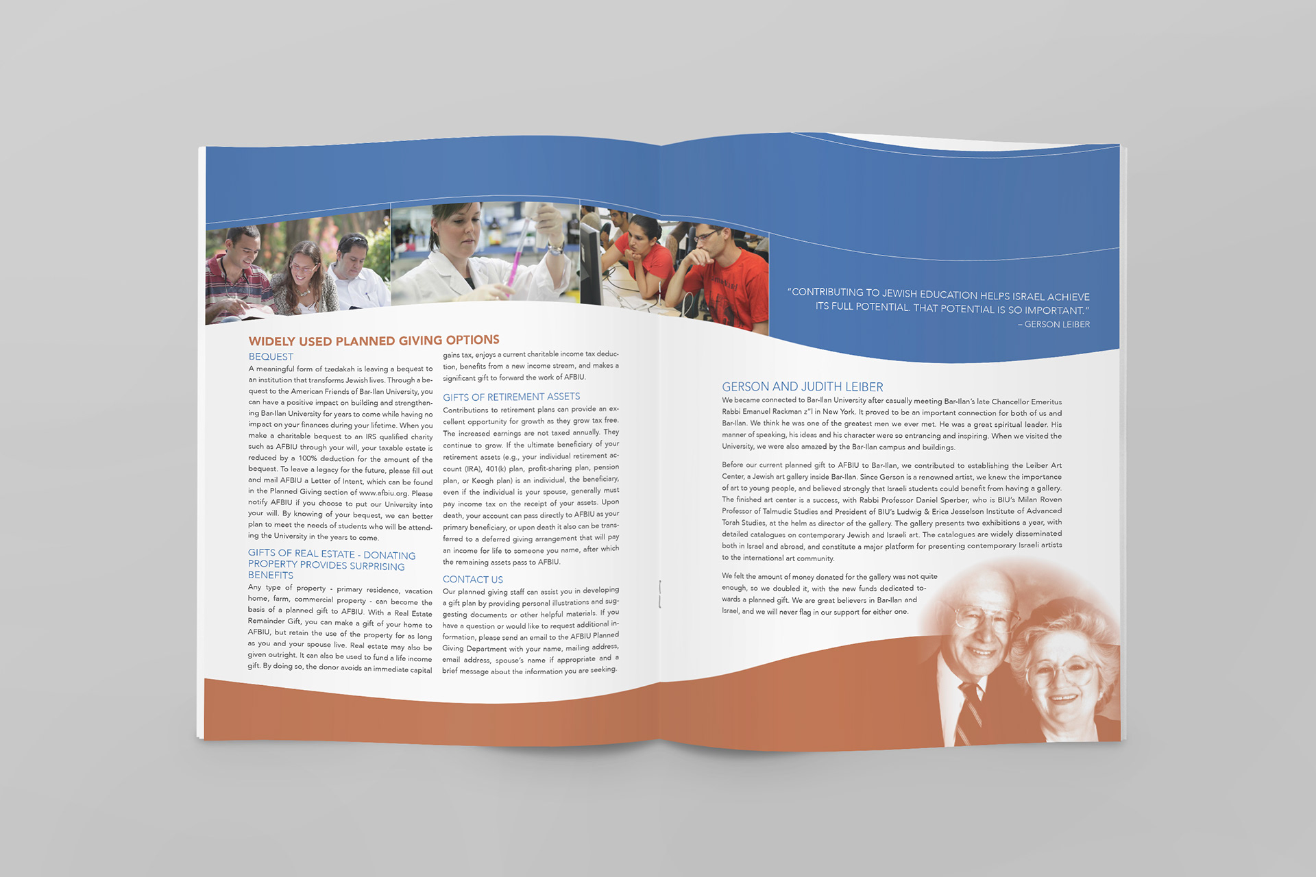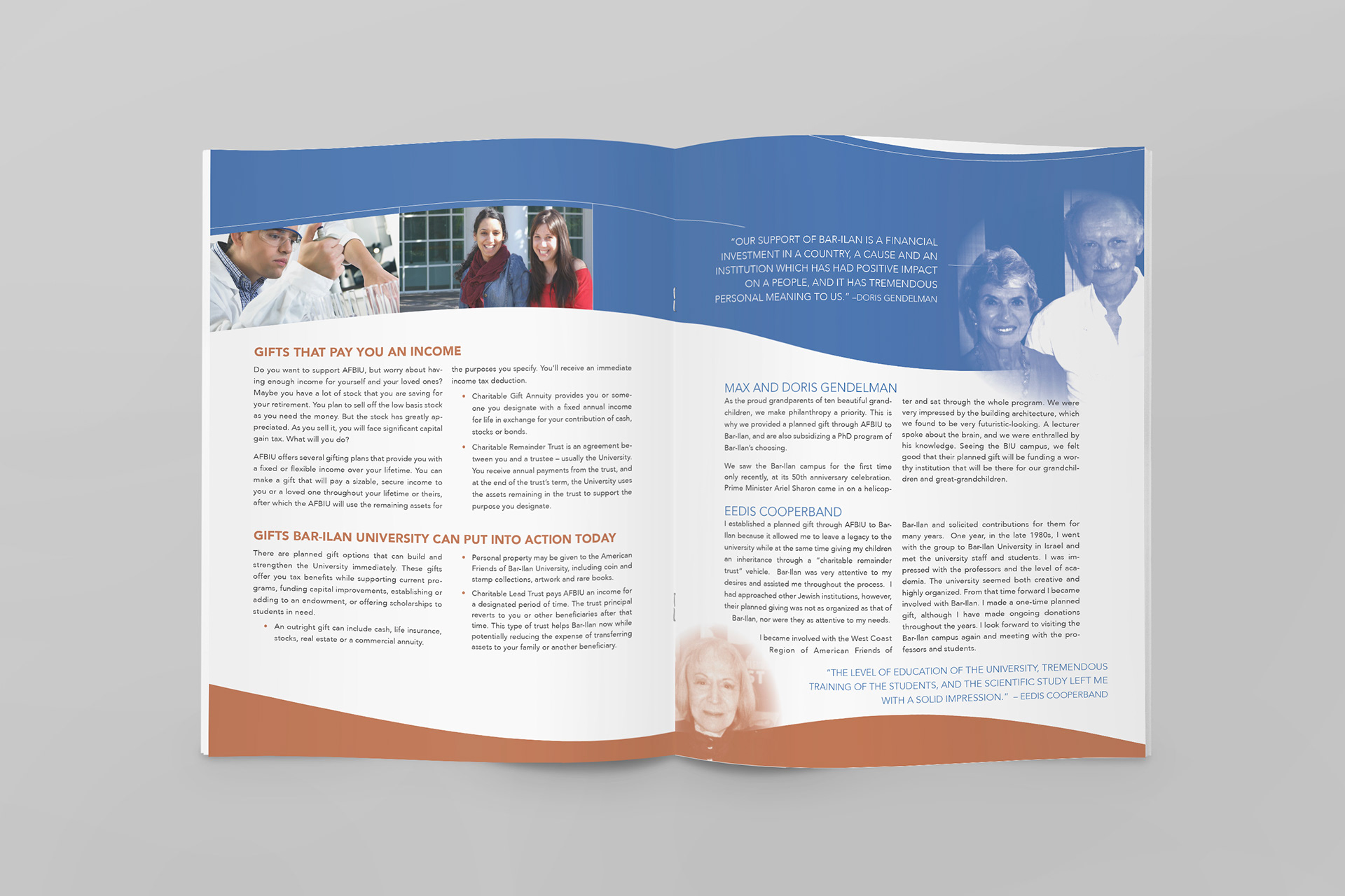 American Friends of Bar Ilan University initiated a "From Generation to Generation" planned giving campaign to support the endowment fund for the largest growing university in Israel. I created the publicity brochure for this campaign.